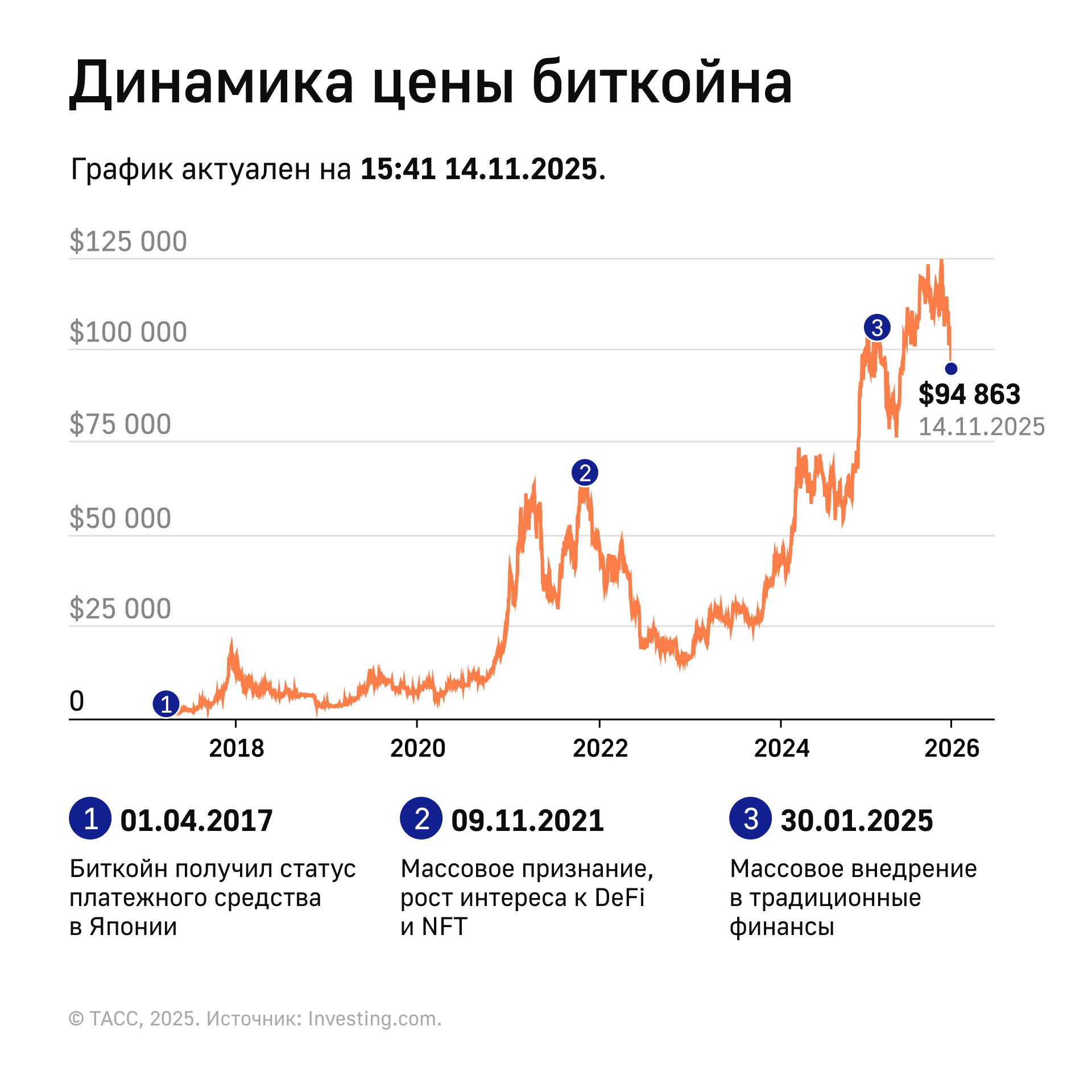 На Binance, самой крупной криптобирже по объему торгов, по состоянию на 6:35 мск биткоин оценивался в 89,7 тысяч долларов. Это значение впервые с 22 апреля упало ниже 90 тысяч долларов.